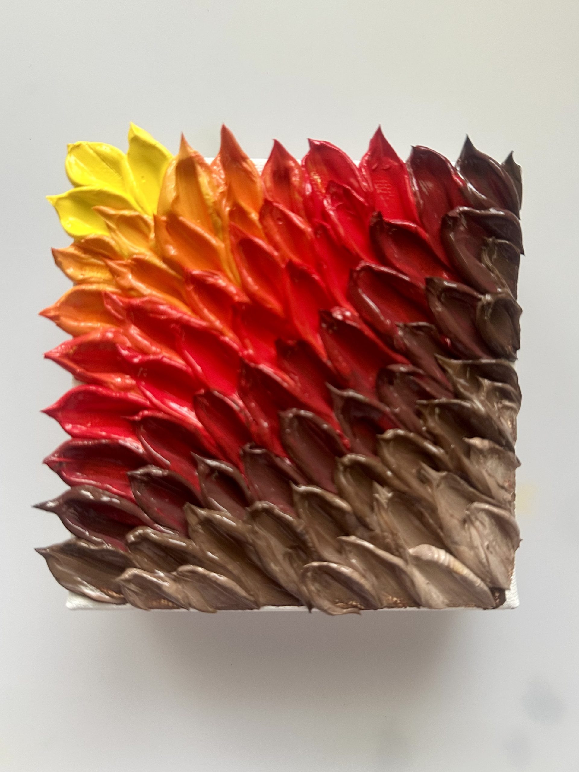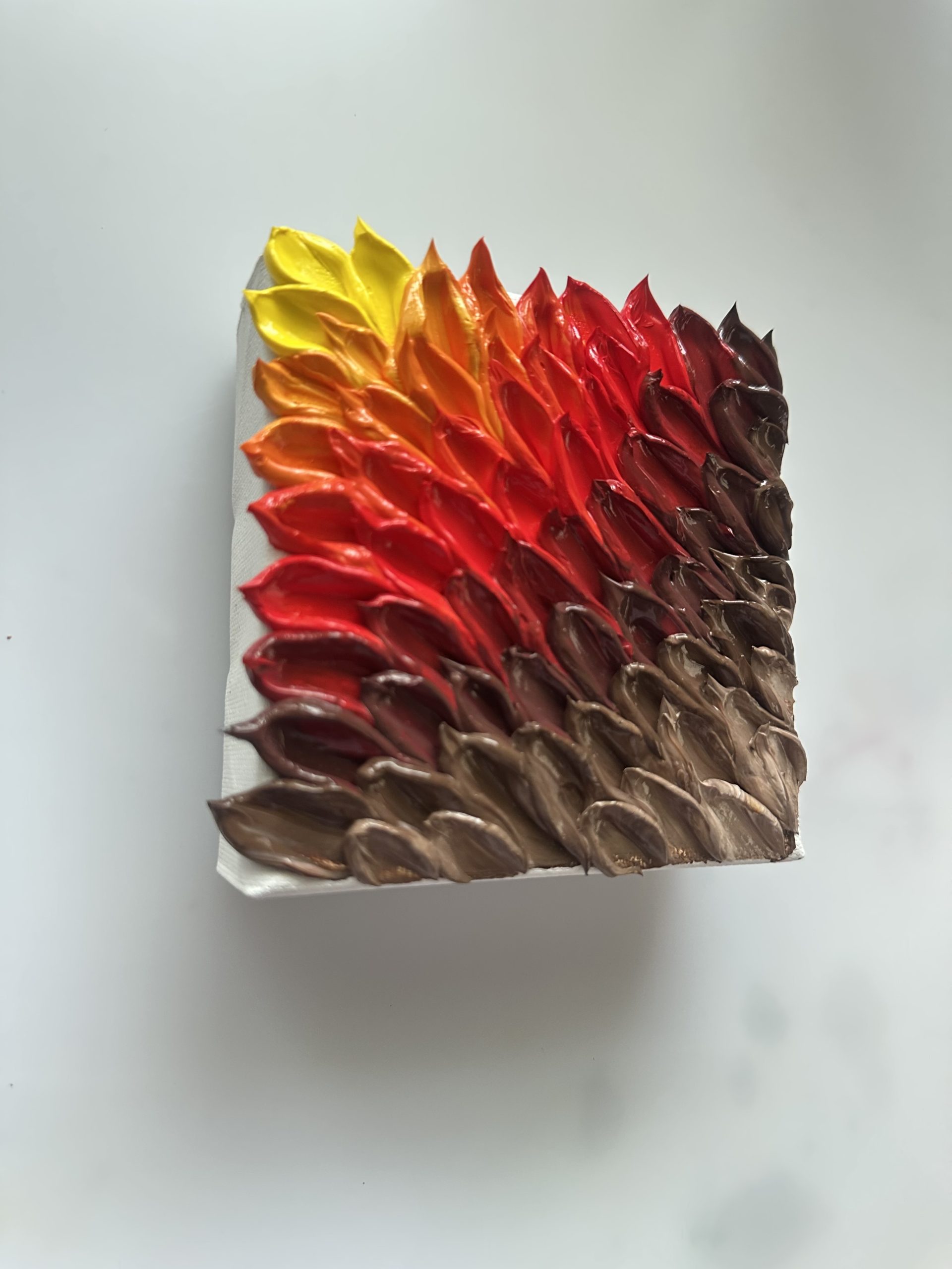 This 4×4 knife painting captures the warmth of autumn through rich, layered textures. Created using a palette knife, the artwork blends earthy reds, burnt oranges, golden yellows, and deep browns to evoke falling leaves and seasonal calm. Its compact size makes it perfect for shelves, desks, or small accent walls, adding a cozy autumnal touch to any space.