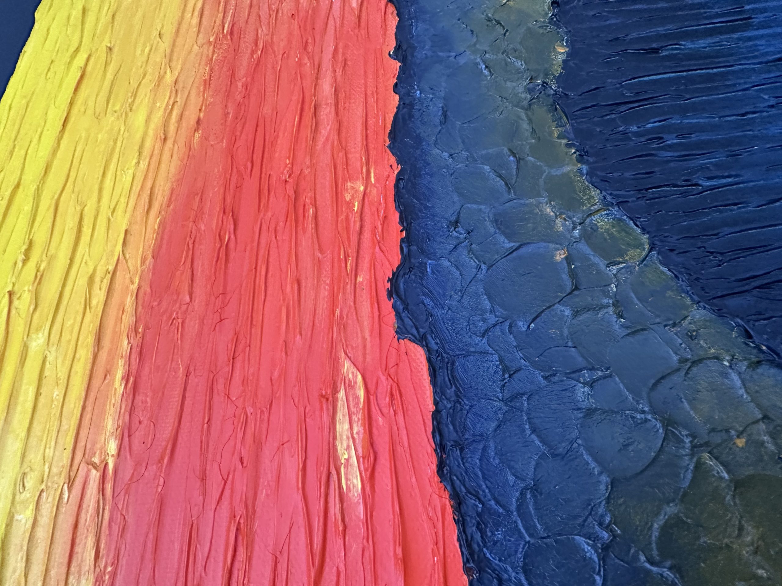 Experience the warmth of a sunrise captured through bold, heavy textures in this abstract mountainscape.