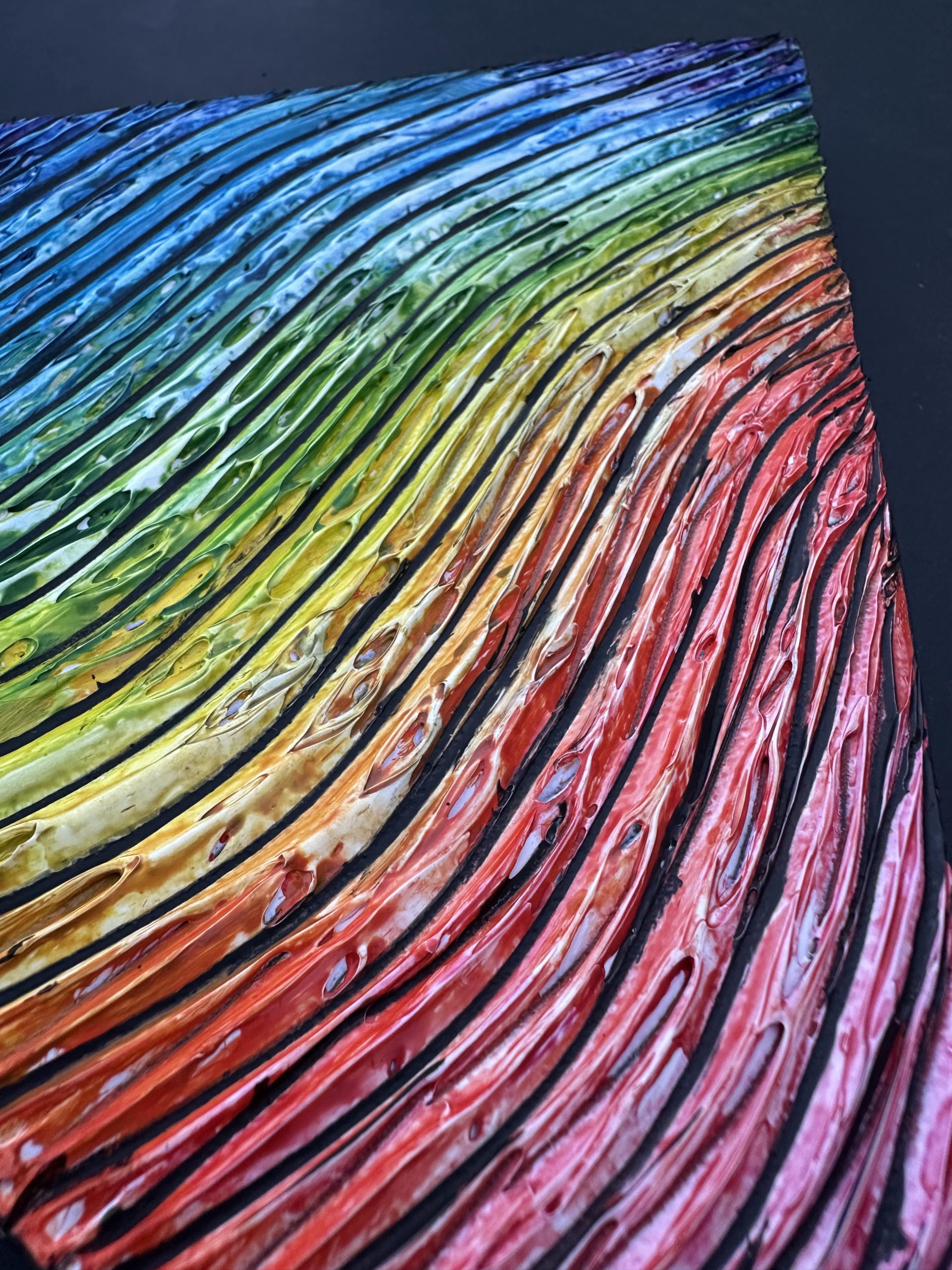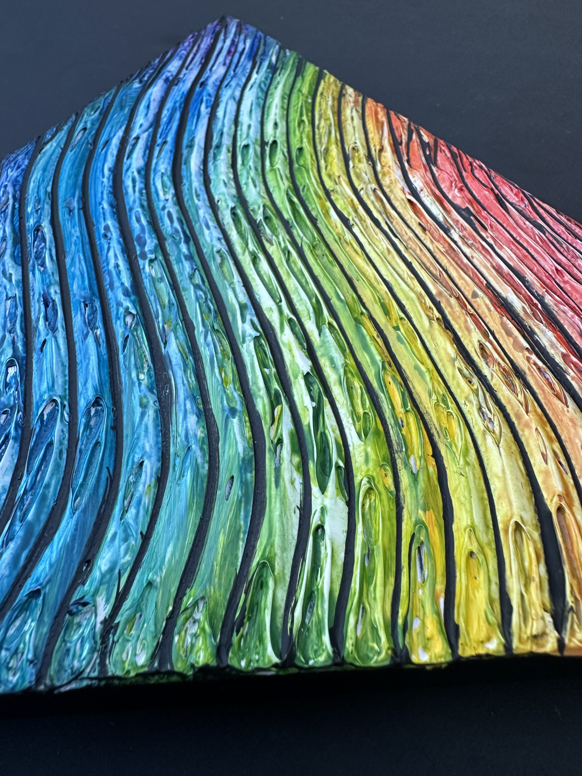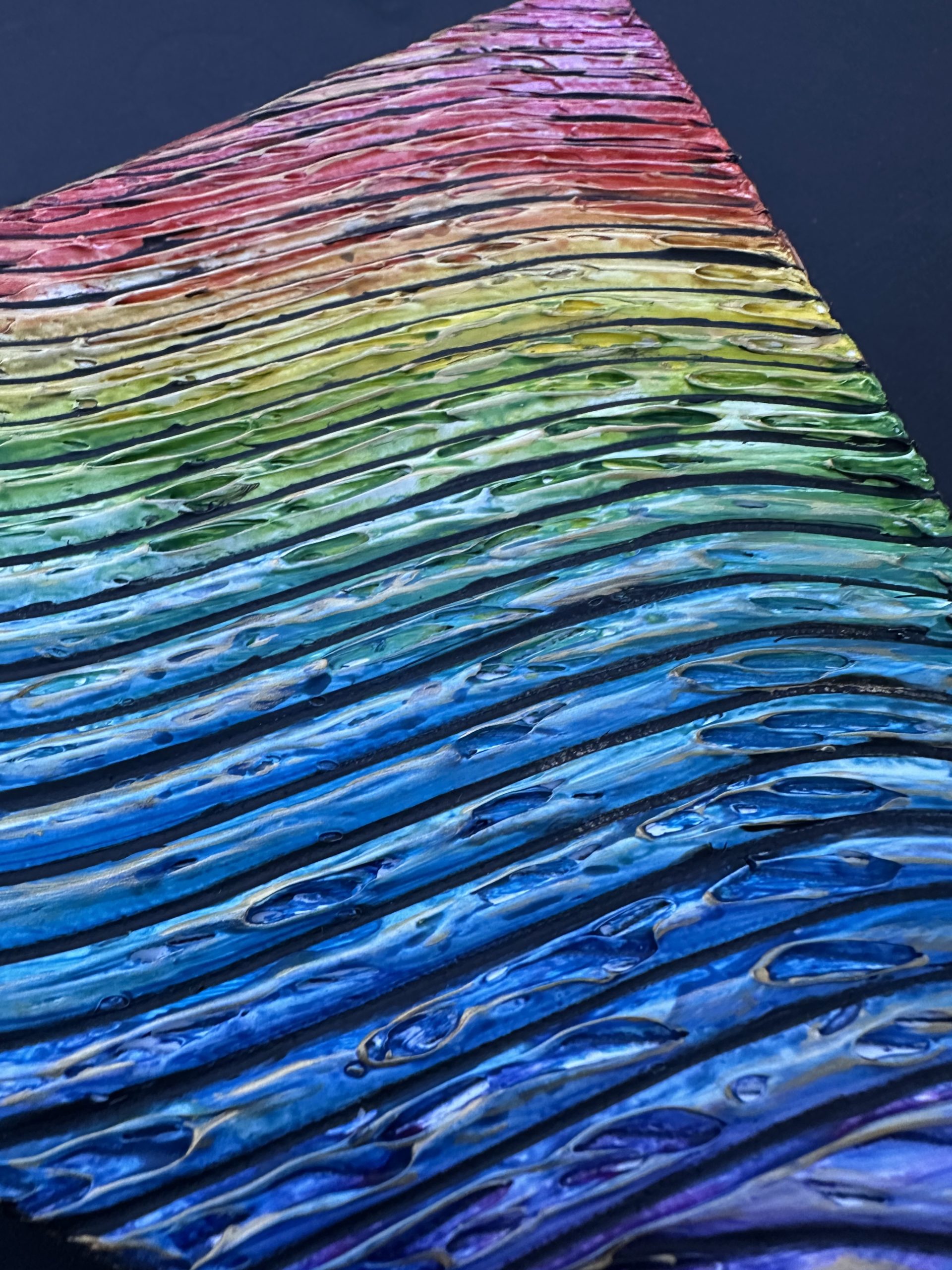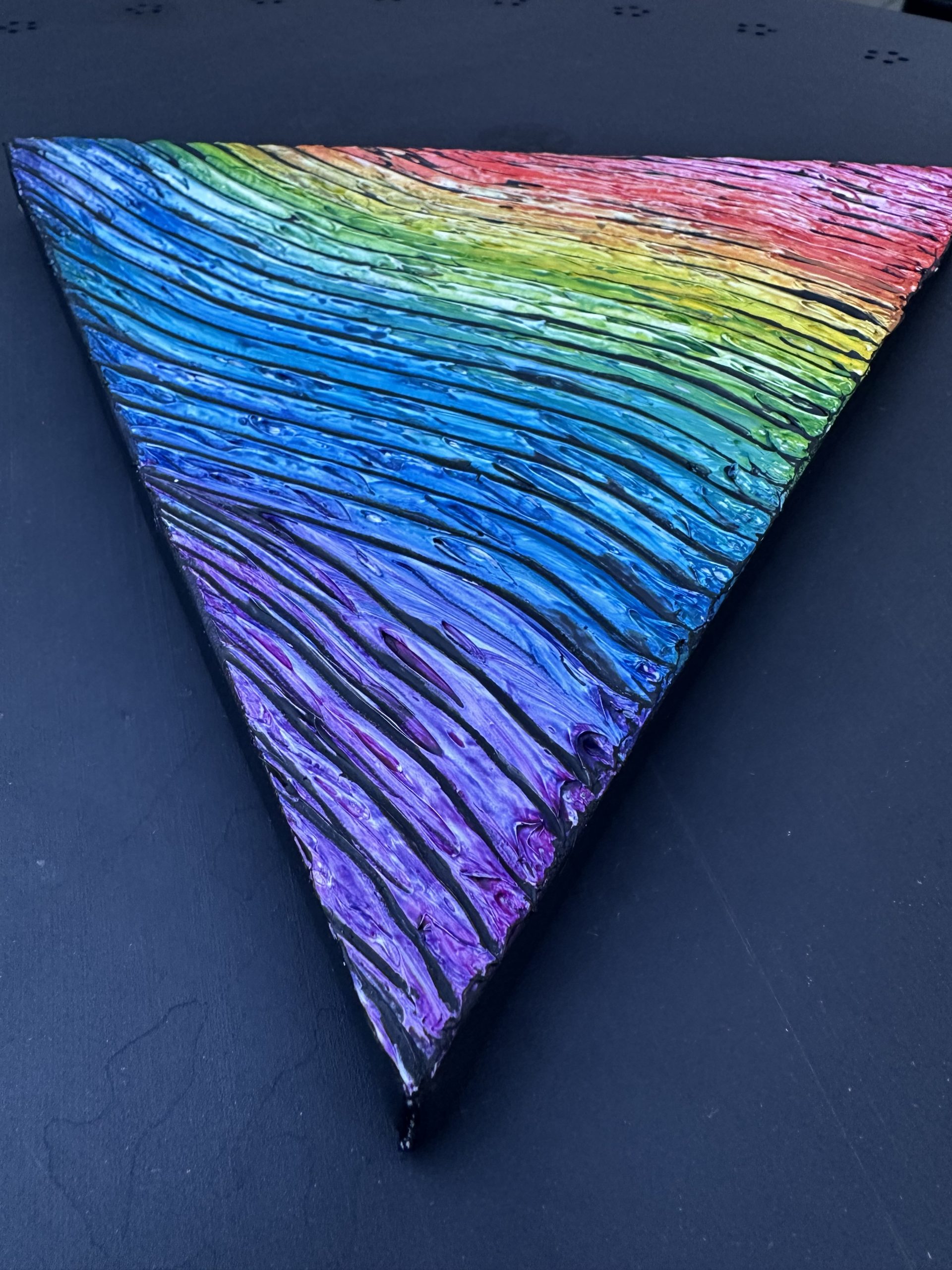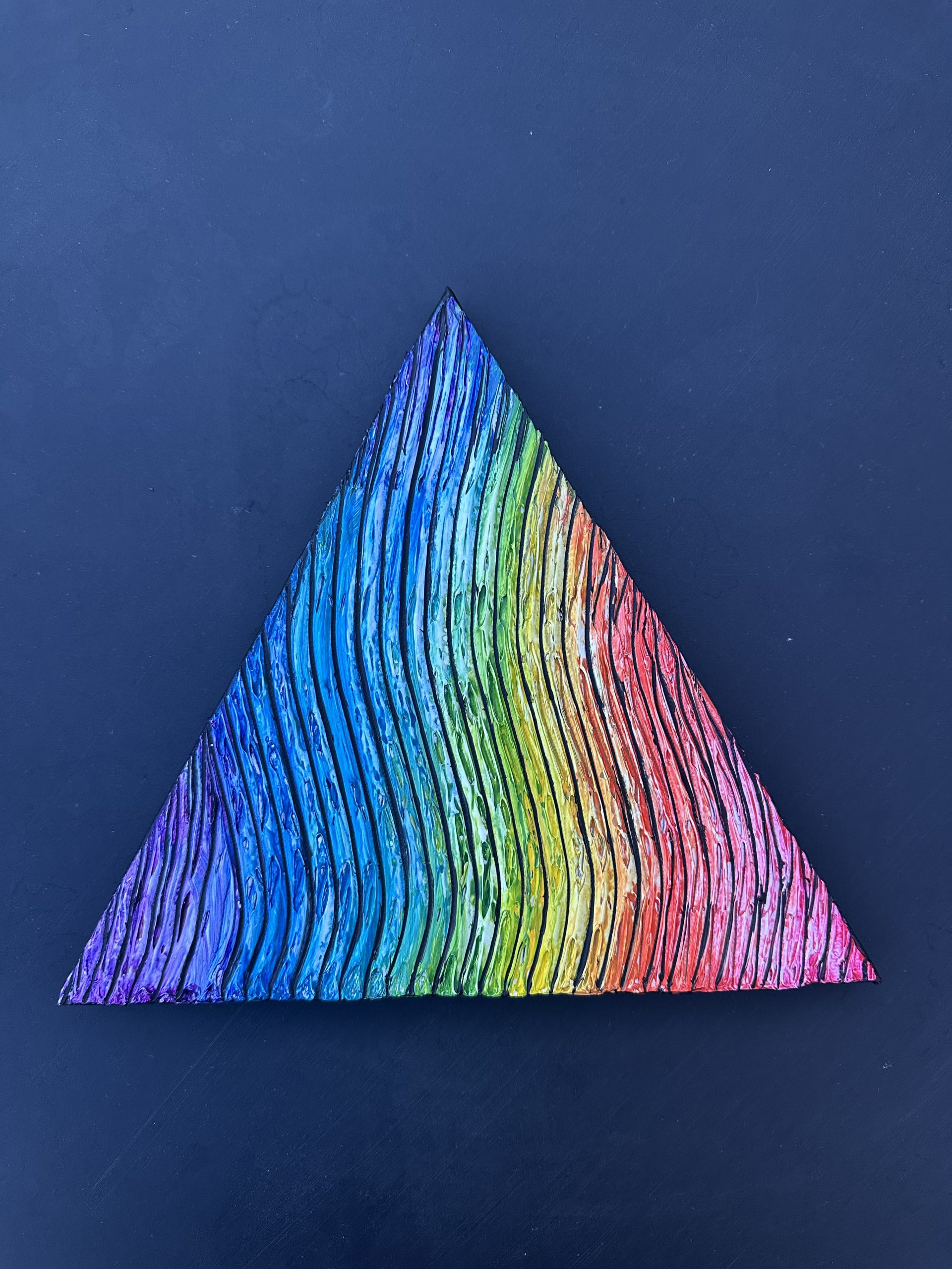 This unique triangle-shaped canvas features a vibrant rainbow painted against a bold black background, enhanced with an elegant golden lining along the edges. The contrast of bright rainbow hues with the dark backdrop creates a striking, modern aesthetic, while the gold detailing adds a touch of luxury and refinement. Perfect for contemporary décor, statement walls, or anyone who loves colorful, geometric, and eye-catching art