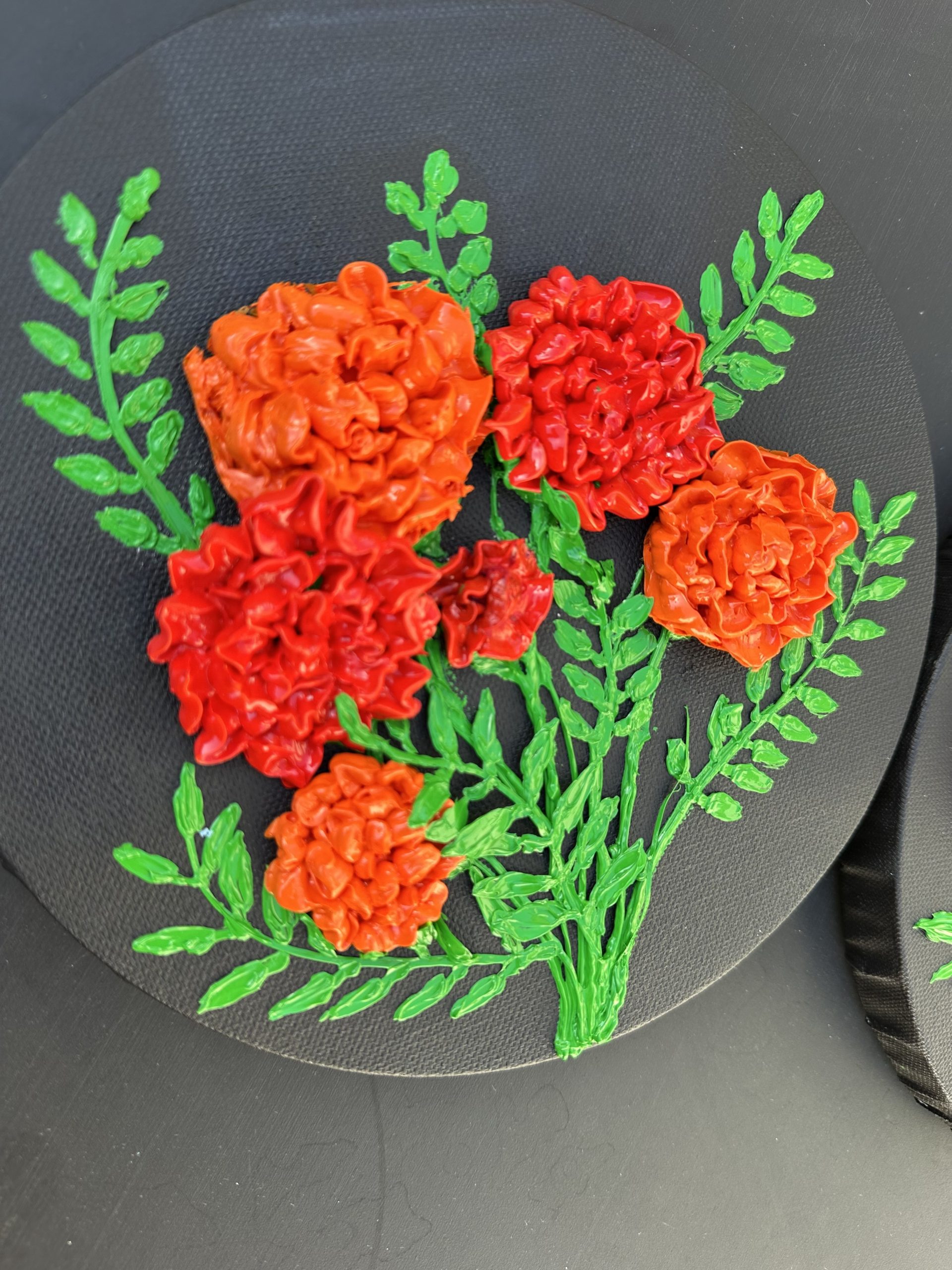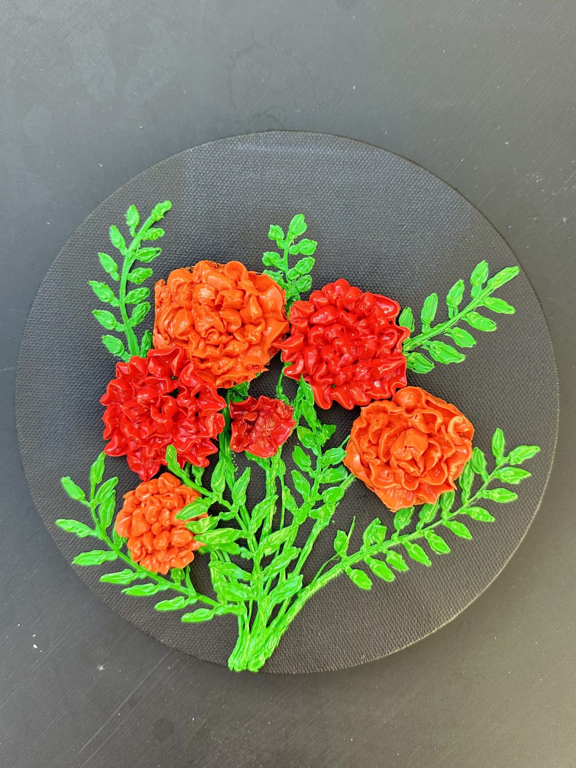 This round canvas showcases vibrant orange and yellow marigold flowers blooming against a rich black background. The bright petals glow with warmth and depth, creating a stunning contrast that highlights the beauty of these festive blooms. The circular composition adds a modern, elegant touch, making this artwork perfect for floral art lovers, contemporary spaces, or anyone looking to add a pop of color and positivity to their home décor.